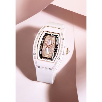 搭配了全新表带、且采用相同材质打造的RM 07-01 Carbone TPT®女士腕表抢先亮相,体现品牌不凡志向。这一凝聚微机械工艺的珠玉之作,结合了令人惊艳的柔软性和出类拔萃的刚性,将表壳的酒桶形设计进一步延伸至腕围四周。